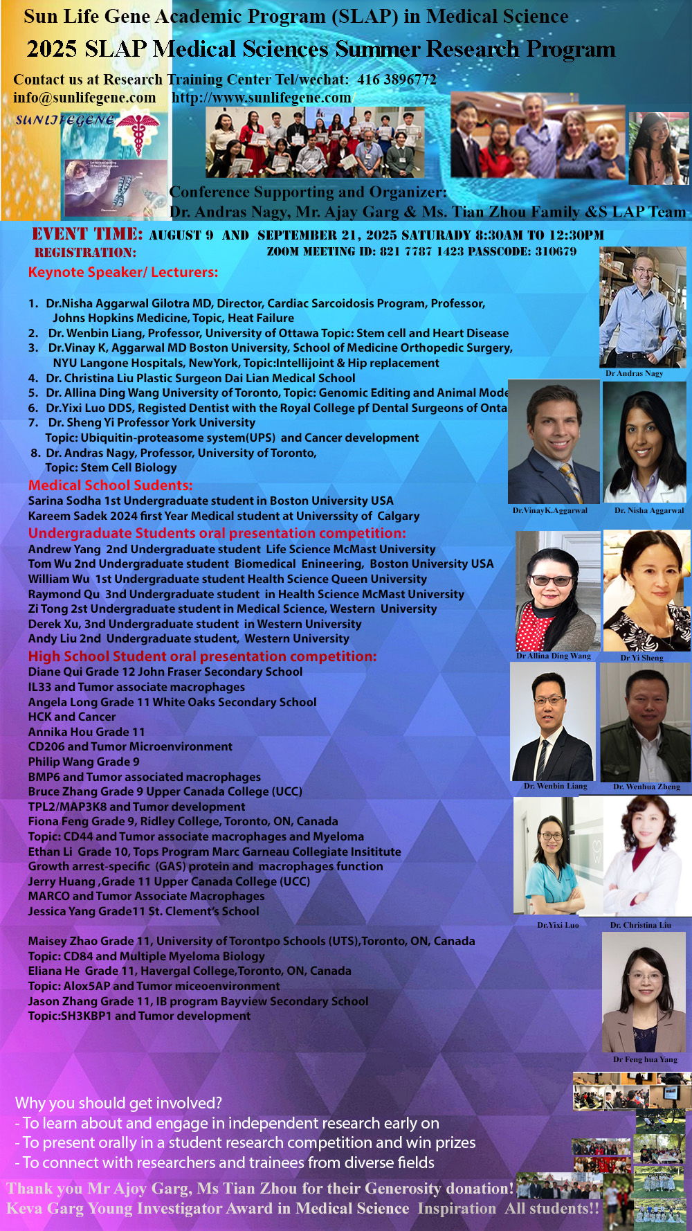 SLAP Team is inviting you to participating 2025 SLAP MEDICAL SCIENCE SUMMER RESEARCH PROGRAM (SMSSRP) Oral presentation Competition event! About the competition We want to know what you did this summer! Come join the SMSSRP student’s Medical Science Research Showcase and share your research with the SUN LIFE GENE community ! 2025 SLAP Student Oral Competition is medical science compete live. All the Medical science research students from Master’s studentss, Medical school student, high school students are invited to do 10 to 20 minutes followed by a two-minute question period from a panel of judges. The oral presentation participating student takes home $25.00 with Certificate of Keva Young Investor Award in Medical Science. 2025 SHOWCASE INFORMATION TO COME. What is the SMSSRP Medical science Research Showcase ? The SMSSRP Medical Science Research Showcase is a weekly events where all students who have been involved in medical science research can showcase the exciting and innovative research they’ve done over the past year and be eligible to win cash prizes. SMSSRP ACADEMIC COMMITTEE: Dr. Andras Nagy, Professor, Temerty Faculty of Medicine, University of Toronto Dr. Wen Bin Liang , Professor, University of Ottawa Dr. Allina Ding Wang, President, Chief Scientific Officer in SUN LIFE GENE Medical Research Institute, Senior Researcher, Temerty Faculty of Medicine, University of Toronto Dr. Nisha Aggarwal, Professor, Johns Hopkins University Medical School Dr. Vinay Aggarwal, Proferssor, New York University Medical School SMSSRP Keva Garg Young Investigator Award STUDENTS ACADEMIC COMMITTEE: Directors: Mr. Ajay Garg, co-founder Keva Garg Young Investigator Award In Medical Science Student Chair: Raymond Qu, 3nd Undergrduate student Health Science, McMaster University Ethan Li Grade 11 Angela Long Grade 11 Annika Hou Grade 11 Diane Qui Grade 12
